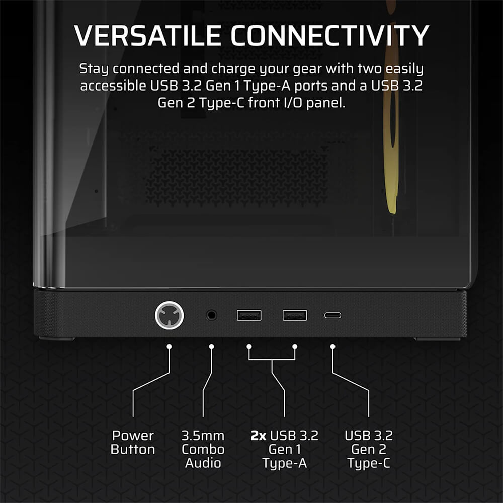 | Case Front IO | (1x) USB 3.2 Gen 2 Type-C, (2x) USB 3.2 Gen 1 Type-A, (1x) Audio in/out |