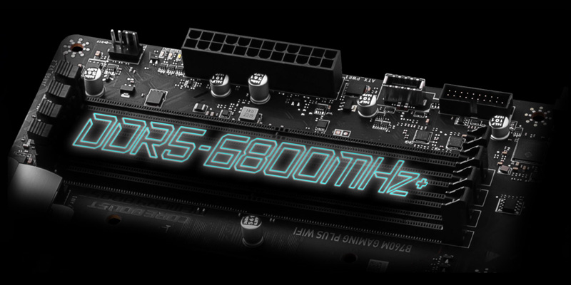 | MEMORY | 4x DDR5, Maximum Memory Capacity 192GB Memory Support DDR5 6800+(OC)/ 6600(OC)/ 6400(OC)/ 6200(OC)/ 6000(OC)/ 5800(OC)/ 5600(JEDEC)/ 5400(JEDEC)/ 5200(JEDEC)/ 5000(JEDEC)/ 4800(JEDEC) MHz Max. overclocking frequency: • 1DPC 1R Max speed up to 6800+ MHz • 1DPC 2R Max speed up to 6400+ MHz • 2DPC 1R Max speed up to 6000+ MHz • 2DPC 2R Max speed up to 5600+ MHzSupports Intel® XMP 3.0 OC Supports Dual-Controller Dual-Channel mode Supports non-ECC, un-buffered memory |