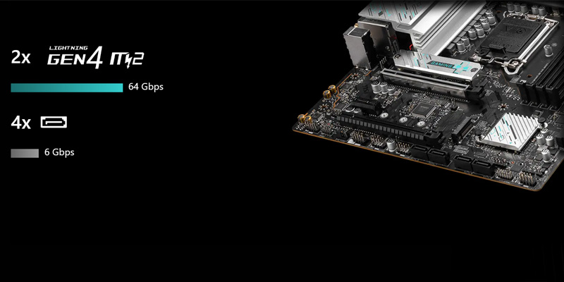 | STORAGE | 2x M.2 M.2_1 Source (From CPU) supports up to PCIe 4.0 x4 , supports 2280/2260/2242 devices M.2_2 Source (From Chipset) supports up to PCIe 4.0 x4 / SATA mode, supports 2280/2260/2242 devices 4x SATA 6G * SATA8 will be unavailable when installing M.2 SATA SSD in the M2_2 slot. |