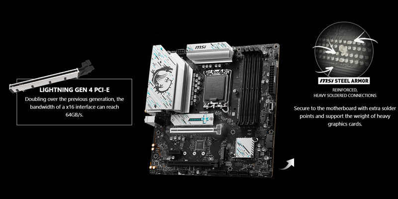 Mainboard PC MSI B760M GAMING PLUS WIFI với giao diện PCIe x16 cho băng thông lên đến 64GB/s và cung cấp hỗ trợ NVMe SSD RAID để tăng hiệu suất đáng kinh ngạc. Tạo cấu hình RAID với thiết bị lưu trữ PCIe để tận hưởng tốc độ truyền dữ liệu nhanh nhất.