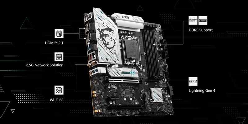 - Hỗ trợ Ram DDR5, PCIe 4.0 slot, Lightning Gen 4 x4 M.2 với M.2 Shield Frozr, và cổng USB 3.2 Gen 2 10G. 2.5G LAN kết hợp với Wi-Fi 6E, Bluetooth 5.3 cung cấp kết nối mạng nhanh chóng và ổn định, phù hợp cho cả người dùng chuyên nghiệp và giải trí.