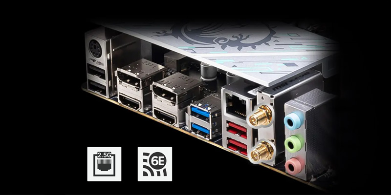 Mainboard PC MSI B760M GAMING PLUS WIFI cung cấp các tùy chọn kết nối mới nhất cho mạng siêu mượt và truyền tệp nhanh chóng, kết hợp mạng không dây Wifi 6E cùng mạng Lan 2.5Gb với khả năng kết nối tốc độ vượt trội để bạn chơi game mượt mà hơn, không bị giật lag.